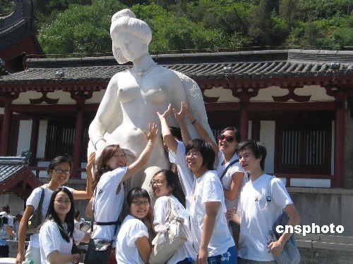 营员们在华清池杨贵妃塑像前留影。(中新社/冽玮)