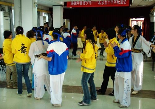开营仪式结束后,泰国华裔青少年还与北京五十中学的学生们进行了联欢,北京五十中学的学生们表演了萨克斯独奏、快板书、独唱和民族舞蹈等,激起了营员们的浓厚兴趣;来自泰国的华裔青少年用中文合唱了“月亮代表我的心”,并热情地邀请北京的学生一起跳起了泰国的民族舞蹈水灯舞和竹竿舞。最后,两地学生还互赠了纪念品。