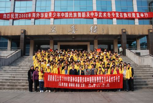12月12日,2008年海外华裔青少年中国民族舞蹈及中华武术冬令营开营仪式在湖南师范大学举行。湖南省海外交流协会副巡视员范建一、湖南省海外交流协会秘书长王建文、湖南省海外交流协会联络处处长邓文盛、湖南师范大学副校长、正校级督导冀学锋及相关学院负责人出席了仪式。