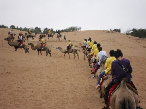 营员们骑骆驼穿行沙漠。
