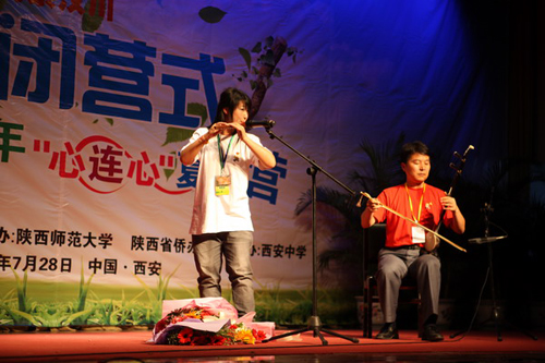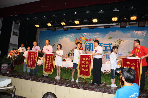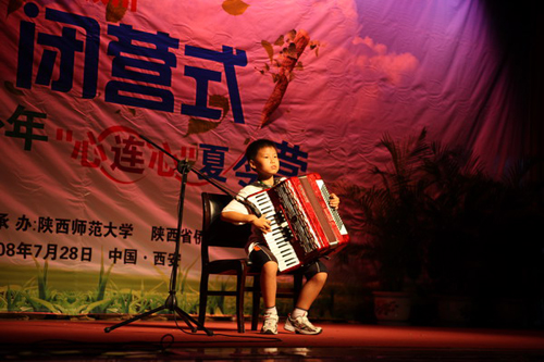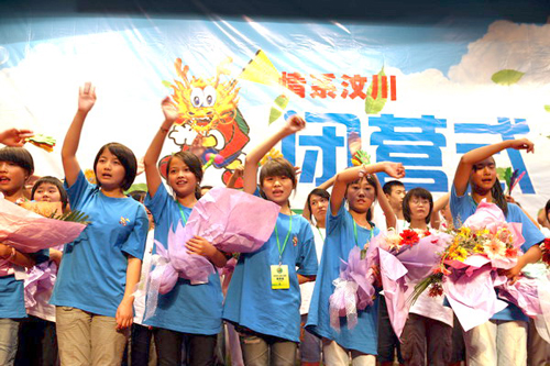 7月28日下午,由国务院侨务办公室主办,陕西师范大学与陕西省侨办承办的“情系汶川—中外青少年‘心连心’夏令营”在陕西师范大学雁塔校区积学堂隆重举行闭营仪式。国侨办文宣司副司长雷振刚、省侨办主任张宝文、陕西师范大学党委书记江秀乐,来自四川、重庆、甘肃、陕西等地震灾区的450名中小学生营员和50名带队教师,与在陕西学习的外国留学生齐聚积学堂,共同庆祝夏令营的圆满成功。
