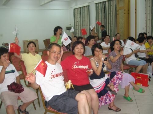 正在华侨大学华文学院参加二〇〇八年夏季海外华文教师多媒体培训班的二十六名海外华文教师更期盼着这一天的到来。华侨大学华文学院为老师们精心准备布置了观看奥运会开幕式的场所,大屏幕的电视机让各位老师看得更清晰,学校还为老师们准备了香槟、啤酒各种饮料各种点心、水果,增添了气氛。大家一起欢呼,一起为中国加油!一起兴奋,为开幕式中国博大精深的文化自豪!