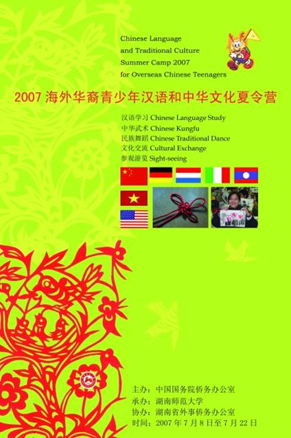 白雪飘飘,烈日炎炎,冬令营,夏令营,一个国家,两个国家、五个国家,从2003至今,湖南师范大学已经成功地举办了5次海外华裔青少年夏、冬令营,把中华文化的种子深深地种在了海外华裔青少年的心田,把祖籍国的深情厚意远播四海五洲,大家在这里收获友谊,收获真情,收获知识。2007年的7月8日至7月22日,来自美国、荷兰、老挝、意大利、德国等五个国家、两百多名华裔青少年,带着好奇与憧憬走进湖南,走进长沙,走进湖南师范大学,参观游览,学习交流,感受中国,感受中化文化,从陌生到相识,从相聚到别离,大家用激情点燃长沙炽热的天空,用真情搭起友谊的桥梁。
