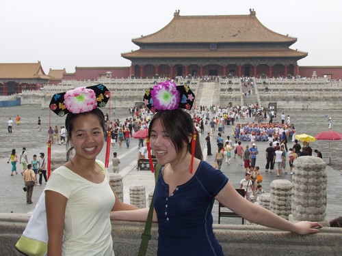 粘华和她的好友黎佳欣都戴着清式妃子的花冠,开心地让朋友们照相