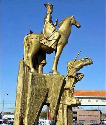 “中国城”中心广场的“西游记”雕像为旅美成都雕塑家郭选昌设计。寓意今天华人来西方取经也取金——寻找新的生存空间与新的发展机会。
