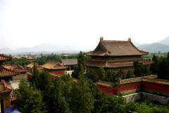 昭陵是清太宗皇太极及其皇后的陵墓,在盛京三陵中规模最大,结构最完整。因坐落在沈阳市北端,故又称北陵。昭陵始建于清崇德八年(公元1643年),与福陵同年竣工,经康熙、嘉庆增建,陵区占地面积近48万平方米,现存古建筑38座(组)。昭陵建在平地上,四周护以缭墙,极似一座小城。主体建筑都建在中轴线上,由南至北依次为:神桥、牌楼、正红门、碑亭、隆恩门、隆恩殿、明楼、宝顶。方城中心的隆恩殿以雕刻精美的花岗岩台阶为底座,黄琉璃瓦顶,再加上画栋雕梁、金匾红墙,前有隆恩门,后有明楼,左右有配殿,四隅有角楼,犹如众星拱月一般,故显得异常雄伟。方城北端为宝城,宝城为月牙形,城内称宝顶,其下即地宫墓室。登上宝顶四望,绿树环合,景色清幽,宛若置身于城市山林中。