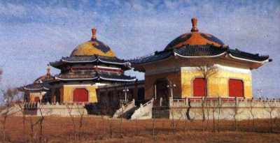 这里牧草腾碧浪,羊群卷雪花。蓝天绿草之间,三座蒙古包式的大殿肃然伫立,明黄的墙壁、朱红的门窗、辉煌夺目的金黄琉璃宝顶,使这座帝陵显得格外庄严。陵园占地面积5万多平方米,主体建筑由三座蒙古包式的大殿和与之相连的廊房组成。陵园分作正殿、寝宫、东殿、西殿、东廊、西廊六个部分。整个陵园的造型,犹如展翅欲飞的雄鹰,极富浓厚的蒙古民族独特的艺术风格。
