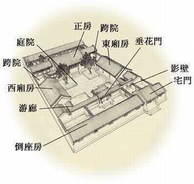 北方院落民居以北京四合院水平最高,也最为典型,是中国汉族传统民居的优秀代表。北京四合院坐北朝南,多有外、内二院。外院横长,大门开在前左角即东南角,称“青龙门”,认为是吉利的。实际上,宅门不设在中轴线上也有利于保持民居的私秘性和增加空间的变化。进入大门迎面有砖影壁一座,与大门组成一个小小的过渡空间。由此西转进入外院。在外院有客房,男仆房、厨房和厕所。由外院向北通过一座造型玲珑,相当华丽的垂花门进入方阔的内院,即为全宅主院。北面正房称堂,最大,供奉“天地君亲师”牌位,举行家庭礼仪,接待尊贵宾客。正房左右接出耳房,居住家庭长辈。耳房前有小小角院,十分安静,也常用作书房。正房前主院两侧各有厢房,是后辈居室。正房、厢房朝向院子都有前廊,用“抄手游廊”把垂花门和三座房屋的前廊连接起来,廊边常设坐凳栏干,可以沿廊走通,不必经过露天,或在廊内坐赏院中花树。正房以后有时有一长排“后照房”,或作居室,或为杂屋。
