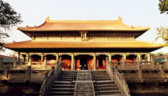 孔庙的杏坛相传是孔子讲学之所,在大成殿前的院落正中。北宋天圣二年(公元1024年)在此建坛,在坛周围环植以杏,命名为杏坛,以纪念孔子杏坛讲学的历史故事。金代又在坛上建亭,大学士党怀英篆书的“杏坛”二字石碑立在亭上。明隆庆三年(公元1569年)重修,即今日之杏坛。杏坛是一座方亭,重檐,四面歇山顶,十字结脊,黄瓦飞檐二层,双重斗拱。亭内藻井雕刻精细,彩绘金龙,色彩绚丽。曾有诗人以妙句描绘杏坛的景色,“独有杏坛春意早,年年花发旧时红”,亭的四周杏树繁茂,生机盎然。大成殿是孔庙的主体建筑,面阔九间,进深五间,高32米,长54米,深34米,重檐九脊,黄瓦飞彩,斗拱交错,雕梁画栋,周环回廊,巍峨壮丽。擎檐有石柱二十八根,高5.98米,直径达0.81 米。两山及后檐的十八根柱子浅雕云龙纹,每柱有七十二团龙。前檐十柱深浮雕云龙纹,每柱二龙对翔,盘绕升腾,似脱壁欲出,精美绝伦。殿内高悬“万世师表” 等十方巨匾,三副楹联,都是清乾隆帝手书。殿正中供奉着孔子的塑像,七十二弟子及儒家的历代先贤塑像分侍左右。历朝历代皇帝的重大祭孔活动就在大殿里举行。殿下是巨型的须弥座石台基,高2米,占地1836平方米。殿前露台轩敞,旧时祭孔的“八佾舞”也在这里举行。