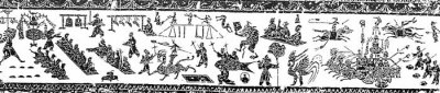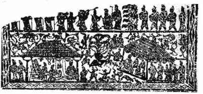 山东沂南县北塞村汉墓百戏画像石(图204)场面阔大,演出内容有奔马戏车等广场演出的独特节目。