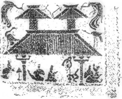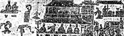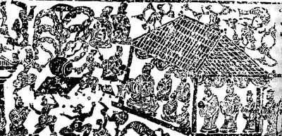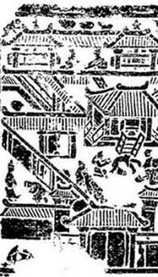 山东曲阜旧县村出土的地主宅院画像石(图200)这是一座小庭深院,进深二重,另有回廊和别的院子分开。前院堂屋外有伎人表演,后院廊下有人抚琴,表现了一般地主的家庭娱乐活动。