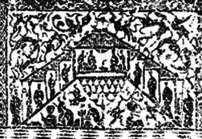 汉武帝喜欢举行广场上的大型百戏演出。历史文献有明确记载:“夏,京师民观角抵与上林平乐观。”意思是说,在夏天京城的老百姓都去上林平乐观看角抵戏。《东汉春》云:皇帝于平乐观下起大坛,设秘戏以示人。平乐观(图203)是汉代长安未央宫里的楼阙,也可以说是最早的戏楼。“大坛”上有华盖,是皇帝看戏的地方。“设秘戏以示人”,说明戏楼建在广场上,很高大。从现存的记载广场演出的画像石我们可以领略当时的气概。
