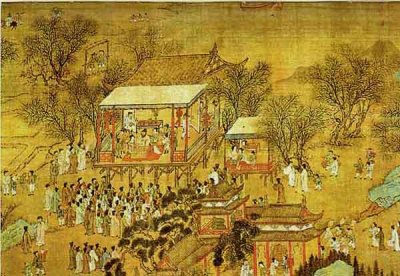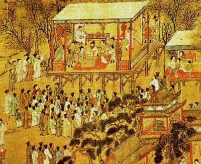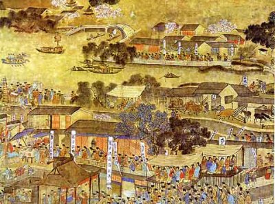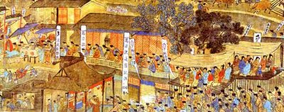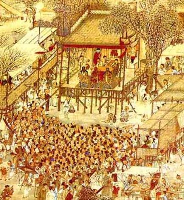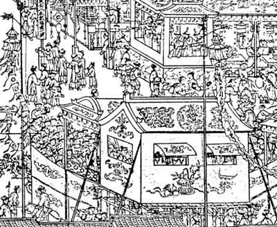 ·明画《南都繁会景物图卷》(见下图),绘的是一幅南京街市三月庆春游艺活动场面,戏台搭在街道正中,用木条和席子搭成,台周有栏杆,台后另搭一戏房,有上下场门与前台相通。观众站在街上看戏,另外,在街道的一边又用木条和木板搭了两座女台,上面遮有布幔,台上坐许多女眷。街道周围的店铺酒楼也挤满了看客。整个街道成了演出场所。