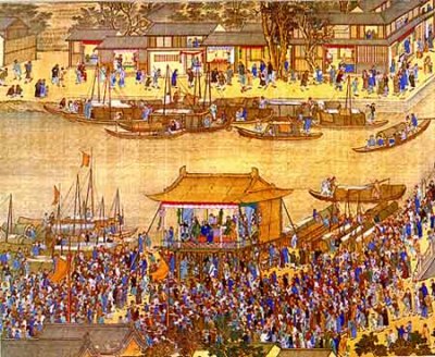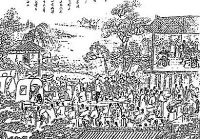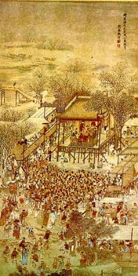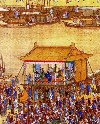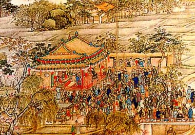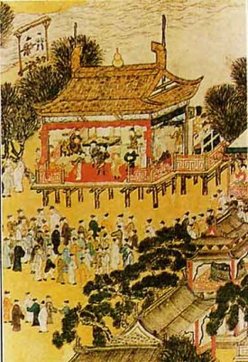 康熙《南巡图》其中画有绍兴柯桥镇搭在桥边的戏台,戏台对面是庙,台周围站满了观众。