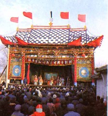 ·山西长治市每年阴历七月初一的大会、元宵节都要在街头搭彩台,彩台用木杆做架,各色布匹缠裹,再挂上装饰物,鲜艳美观。一般搭一层或两层;也有搭三层的;第一层用来演出;第二层陈列草扎戏剧人物;第三层只放一大鼓。通常的“上党台”为两层彩台,高17.5米,宽13米,深15米,表演区9米见方,台基高出地面 1.5米左右。