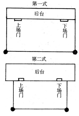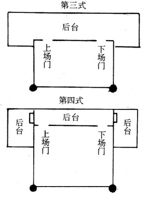 前台是表演区。后台,又称戏房。最初只是在舞台后隔出1/3的空间,用于演员化装及存放戏箱,后来得以扩展。戏台内部结构大致有四种形态(见下图)。第一式为最古老的一种形态,是从宋、元时的舞亭演化而来;第四式是舞台建筑形制确立后才出现的。