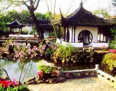 拙政园占地62亩,是目前苏州最大的古园林、我国四大名园之一。拙政园布局主题以水为中心,池水面积约占总面积的五分之一,各种亭台轩榭多临水而筑。全园分东、中、西三个部分,中园是其主体和精华所在。远香堂是中园的主体建筑,其他一切景点均围绕远香堂而建。堂南筑有黄石假山,山上配植林木。堂北临水,水池中以土石垒成东西两山,两山之间,连以溪桥。西山上有雪香云蔚亭,东山上有待霜亭,形成对景。由雪香云蔚亭下山,可到园西南部的荷风四面亭,由此亭经柳荫路曲西去,可以北登见山楼,往南可至倚玉轩,向西则入别有洞天。远香堂东有绿漪堂、梧竹幽居、绣绮亭、枇杷园、海棠春坞、玲珑馆等处。堂西则有小飞虹、小沧浪等处。小沧浪北是旱船香洲,香洲西南乃玉兰堂。进入别有洞天门即可到达西园。