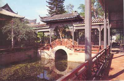东半部的中央为一八角形水池,池中有八角亭一座,名“玲珑水榭”,原是赋诗把酒、吟风弄月之所,有丹桂迎旭日、杨柳楼台青、腊梅花盛开、石林咫尺形、虹桥清晖映、卧瓢听琴声、果坛兰幽径、孔雀尽开屏之八角玲珑。水榭东南沿园墙布置了假山;水榭东北点缀着挺秀的孔雀亭和半边亭(来薰亭)。周围还有许多株大树菠萝、腊梅花树、南洋水杉等珍贵古树。“来薰亭”半身倚墙而筑,“卧瓢庐”幽辟北隅,“杨柳楼台”沟通内外,近观南山第一峰,远接莲花古塔影。东西两半部的景物,通过名叫“浣红跨绿”的拱桥有机地结合在一起。
