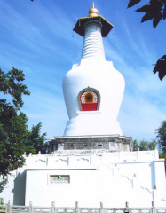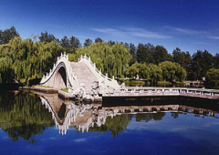 小金山西麓有一堤通入湖中,堤端为一方亭,名“吹台”。相传乾隆皇帝在这里钓过鱼,因而又叫钓鱼台。钓鱼台三面临水,各有圆门一孔。从钓鱼台前右侧看去,正中圆洞恰好收入“五亭桥”一景,左面圆洞正好收入“白塔”一景,俨然两张独幅画面,其借景手法之巧,令人钦佩。月观是临湖建筑的厅堂,四面皆为格扇,堂后是桂园。当8月桂花盛开之际,推窗赏月,清香四溢,天上水下两月同收眼底,此情此景,甚为动人。五亭桥建造在瘦西湖上,好像湖的一根腰带。桥上建有五座亭子,故名五亭桥。这座很具特色的美丽的桥,已经成为扬州风景线的一个标志。五亭桥是清代扬州两淮盐运使为了迎接乾隆南巡,特雇请能工巧匠设计建造的。桥的造型典雅秀丽,黄瓦朱柱,配以白色栏杆,亭内彩绘藻井,富丽堂皇,具有南方建筑的特色。而桥下则是具有北方建筑特色的厚实桥墩,和谐地把南北方建筑艺术,把园林设计和桥梁工程结合起来。五亭桥有15个桥洞,十五月圆之夜,每洞各衔一月,15个圆月倒悬水中,争相辉映,泛舟穿插洞间,别具情趣。