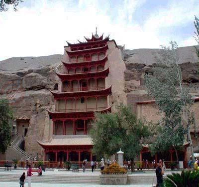 莫高窟在今甘肃敦煌城东南25公里的鸣沙山与三危山之间的断崖上,所占崖面全长1618米,绝大部分洞窟分布在南段长约1000米的地段内,仅有少量在崖壁的北端。莫高窟开凿于十六国时期前秦建元二年(公元366年),一说是东晋永和九年(公元353年),历经了前秦、北凉、西魏、北周、隋、唐、五代、宋、西夏、元、清等朝代,共留存大小洞窟491座,塑像2400多躯。莫高窟采用木构建筑,现多已毁灭,仅存唐宋时期的木构窟檐5座。这些塑像、窟檐和45000余平方米的壁画一起,构成了完整的敦煌艺术。
