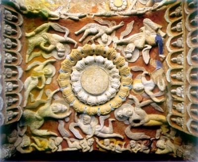 昙曜五窟现编号第16——20窟,是由昙曜和尚主持开凿的第一期窟洞,也是云冈石窟最引人注目的部分之一。据《魏书·释老志》载:“和平初,……昙曜白帝,于京城西武州塞,凿山石壁,开窟五所,镌建佛各一,高者七十尺,次六十尺,雕饰奇伟,冠于一世。”以道武、明元、太武、景穆、文成五帝为楷模,雕刻五尊大像。这五窟规模宏大,气魄雄伟。形制上共同特点是外壁满雕千佛,大体上都摹拟椭圆形的草庐形式,无后室。造像主要是三世佛(过去、未来、现在),主佛形体高大,占窟内主要位置。