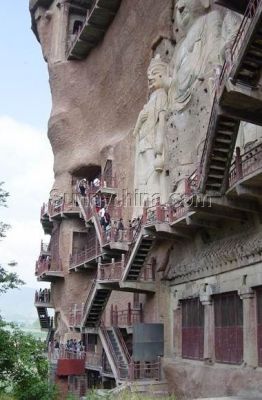 麦积山石窟是中国大型石窟群之一,“丝绸之路”上重要的宗教艺术古迹,全国重点文物保护单位,中国著名风景名胜区之一。位于甘肃天水县麦积乡南侧,是西秦岭山脉北支小陇山前山区的孤峰,相对高度142米。峰顶呈圆锥状,红色砂砾岩层略近水平,因岩体形如农村麦垛而得名。石窟创建于十六国姚秦时期(约384),大兴于北魏太和元年(477)以后,西魏再修崖阁寺宇,北周造七佛阁,隋初建舍利塔,又于七佛阁下雕出高达15米的摩崖大石佛三身,为麦积山最大雕像。唐开元二十二年(734)天水一带发生大地震,崖面中部塌毁,分窟群为东崖和西崖两部分,即五代时所谓东阁和西阁。唐、五代、宋、元、明、清各代均曾增建重修。东崖以涅□窟、千佛廊、散花楼、上七佛阁、中七佛阁和牛儿堂等最为重要,规模宏大;西崖共140窟,最重要的三大窟中以万佛堂最大,天堂洞次之,127号窟最小,皆开凿于6世纪。石窟高峻惊险,凌空凿于20~80米的悬崖峭壁上,星罗棋布,层层相叠。有崖阁、摩崖窟、摩崖龛、山楼、走廊及不同类型的窟形与窟龛等,是研究中西文化交流和古代政治、经济、文化、宗教及建筑结构演变发展的重要依据。石窟以精美泥塑艺术著称于世,还有少量石刻像和像碑,反映出中国历代雕塑艺术特点。现存窟龛194个,塑像7800身;壁画1100平方米,仅占原有壁画3/10。