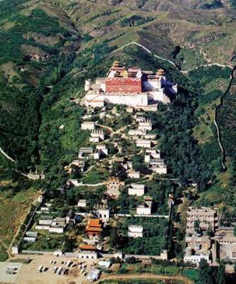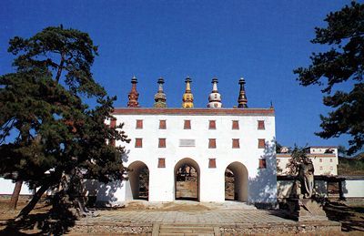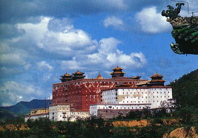 1、山门: 山门面南,门前有一座汉式五孔石拱桥。山门两侧立有石狮一对。山门下砌墩台,上建殿宇,是城楼式的建筑。墩台四面对称排列黑框红底的藏式梯形盲窗,中辟三个拱门。在正中拱门上面刻有乾隆皇帝亲题的“普陀宗乘之庙”的满、汉、蒙、藏四体文字的石匾。“普陀宗乘之庙”意思是:藏传佛教的中心布达拉宫。平台上殿字面宽五间,进深一间,单据庑殿式绿琉璃瓦顶。殿内从左至右供三尊护法神:四面护法神、章古鲁蓬护法神、大黑天玛哈嘎拉护法神。东西两侧宫墙中间建有与山门式样相同的重台城楼,并有乾隆御笔门额,东门为“威严总持”,西门为“宝光普耀”。东西两侧的庑殿内各供一尊护法明王。