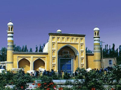喀什艾提卡尔大寺艾提卡尔清真寺约创建于500多年以前,现有面貌形成于19世纪后叶,是中国最大的伊斯兰礼拜寺。寺座西面东,大门开在东南角。门楼砖砌,正中是尖拱大龛,门墙左右以院墙连接两座宣礼塔。门左院墙很短,宣礼塔比较粗壮,右墙较长,塔较为纤细,以门为中心,取得了不对称均衡构图。院墙上也有尖拱龛,圆形的宣礼塔上有穹窿顶小亭,许多大小尖拱尖顶的不断出现,强调了造型手法的统一。礼拜殿在院子西侧,座西向东。中国伊斯兰教礼拜殿都采取这个方向,使得信徒在面向礼拜殿后墙上的圣龛祈祷时,同时也朝向阿拉伯麦加的圣寺。礼拜殿分外殿、内殿。外殿很长,向前完全敞开,采用本地古代已有的木柱密梁平顶结构。内殿三面为外殿所围,前墙正中开门洞,有非常精美的石膏几何花纹。