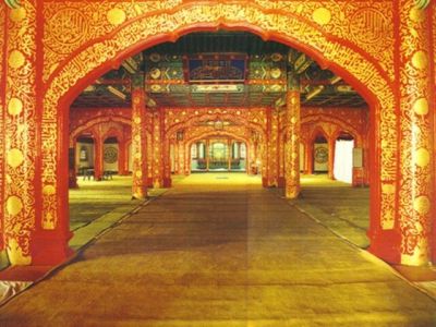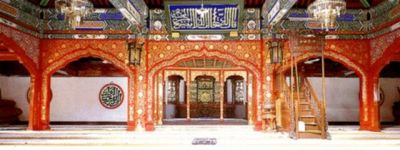北京牛街清真寺牛街礼拜寺初建于明,是回族伊斯兰建筑,居北京四大清真寺之首。牛街清真寺的总平面布局很有特点。寺在牛街东侧,大殿必须座西向东,入口就只能设在殿的后面。寺门以望月楼代替,楼前有木牌楼三间,隔街为照壁,以强调入口。从望月楼下进入寺院,为避免一入寺就面对大殿背面,在殿后增加一堵院墙,引导行人折转到大殿左右夹道再进入寺内,然后绕行殿东,折回进入大殿。大殿东是一座四合院,正中有楼,左右各有碑亭,东面为经学教室。大殿由前殿、主殿和窑殿组成。前殿为硬山卷棚屋顶;主殿由两个歇山屋顶前后串连组成;窑殿很小,高耸着攒尖屋顶。殿内装饰很有特色,柱间设置由阿拉伯的尖拱转变成的“欢门”,柱子和欢门满饰红地金花图案:门框是阿拉伯经文,其它面积和柱子都是卷草和团花。天花和梁枋彩画以青绿冷色为主,与欢门和柱子的一片金红有强烈的对比,非常华丽辉煌。