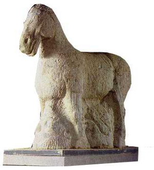 跃马,石刻高1.14米,长2.60米。作品所表现的是一匹转战千里、久经沙场的战马。那修剪得整齐的短鬃,短而尖的双耳,以及惊觉的神态,流露出作者的寓意。马头上仰,似乎在谛听远方传来的声音,注视着前方的动静。右前蹄略微抬起,左前蹄紧扣住地面,后腿正在用力,这是从卧转入起时一瞬间的动作。静中有动,具有强烈的艺术效果。