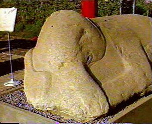 卧象,高0.58米,长1.80米,宽1.03米。卧姿、前肢盘曲,象鼻斜搭于前足之上,宁静中透出顽皮可爱的神情,头部轮廓采用圆雕手法简练雕凿而成,从整体看去,栩栩如生,不失温驯之感。