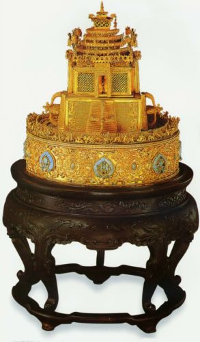 坛城即梵语中所称的曼陀罗,佛教密宗认为这是圣贤集会修行的地方。满清贵族崇尚藏传佛教,宫中多供养密宗法器,此件坛城即为清宫旧藏,其制作之精工,无以复加,不仅体现了一流的工艺水平,而且具有相当的宗教价值,实为珍贵。