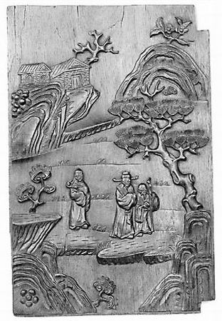 明代黄花梨山水人物纹浮雕。作品雕刻三仙出游于空山幽谷之中,形神之间传递着宋元山水画笔意。