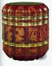这件漆奁制作成为莲瓣形,分成四层,木胎髹朱漆,口沿处包镶银。盖面戗刻园林仕女图。在朱红色的漆地上戗刻金纹,人物、山石、花卉,无不精致高雅,繁丽绚烂,具有极佳的装饰效果。图中描绘仕女二人,身着花罗直领对襟衫,长裙曳地,发髻高耸,手执团扇、折扇,相挽款款而行。一旁有女童捧瓶而立。园中山石、柳树、花径,并设藤墩,环境宜人。奁身十二棱间细刻莲花、牡丹等折枝花卉,密丽华美。