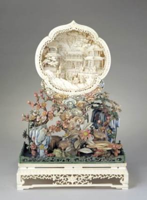 此件作品以镂空、浮雕、拨镂、拼镶等技巧把景物刻画得玲珑剔透,景致由近及远,层次分明,在4cm厚的象牙上所刻层次达15层之多,楼阁曲栏雕得细如发丝,人物神态逼真如生,其工艺精妙无比,巧夺天工。屏与座之纹饰表达了“芝仙祝寿”、“长寿平安”、“福寿万年”等吉祥寓意。