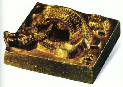 金印铸造成型,阴刻白文篆书,盘龙形印钮。印文为“文帝行玺”四字,字形平正,以田字格加以分隔,更显端方古朴,匀称严谨;笔划坚挺,有肃穆之气。龙钮作盘旋状,龙首稍许突出在金印一角之外,似在潜伏中正积蓄全身的力量,意欲腾飞出击,龙体雕刻刚健,充满了生命力。