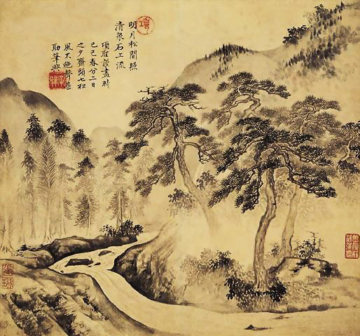 王维诗现存不满400首。其中最能代表其创作特色的是描绘山水田园等自然风景及歌咏隐居生活的诗篇。王维描绘自然风景的高度成就,使他在盛唐诗坛独树一帜,成为山水田园诗派的代表人物。他继承和发展了谢灵运开创的写作山水诗的传统,对陶渊明田园诗的清新自然也有所吸取,使山水田园诗的成就达到了一个高峰,因而在中国诗歌史上占有重要的位置。