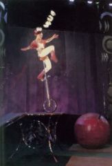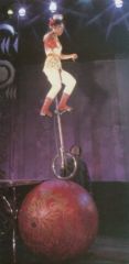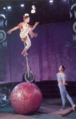傅秀玉矫捷地登上1.7米高的独轮车,在桥板上骑车爬坡,最后登上台桌,依次把十个碗踢上头顶。然后便缓缓地向紧依台桌并与台桌一般高的红木球上进发,车轮与大球的接触面只有3平方厘米。在离地近3米的车座上,既要在两个滚动的圆体间掌握好平衡,又要抓住相对静止的瞬间把碗踢到头上。当她一个碗,两个碗,继而一把壶,最后又踢出一只壶盖不偏不倚落在壶口上时,人们才真相信:又一个奇迹出现了。