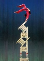 《椅子顶》是在正反叠擦起来的椅子上进行各种倒立表演。孔红文在《椅子顶》表演中,充分展示了她的顶功才能。她的“单臂顶”、“垂腰顶”、“倒手顶”,轻盈舒展,挺拔优美。最后她在叠垒的第四把椅子上放一个小凳,凳上有一固定的拐子状木托,她将三块长方形木砖在木托上竖着垒起,单手握住活木砖,拔起身体做单手顶,姿势形成后又猛然把砖推开,手臂迅疾支撑在木托上;接着又伸直胳膊,并腿并手成直臂顶,再倒把换另一臂顶立。这一系列倒立技巧做得稳健灵巧、轻松自如。