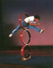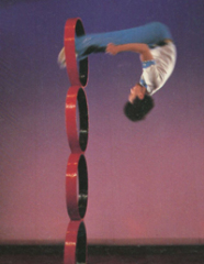 广东杂技团的演员技艺超群。他们在直径仅比身体宽10厘米的圆圈中,跃来跳去,敏捷如飞燕。当圈叠到第四个时,顶圈的圆心高度为2.15米,演员就在这个高度上飞腾而过,同时翻着各式跟头。尤为惊险的是,一名演员在圈中转体360度飞越而出,双脚轻轻落地。当他两臂舒展,轻松微笑着向大家致意时,观众狂热地喝彩起来。因为在当今世界上,能跳过2.15米的人屈指可数,而中国杂技演员不仅跳得高,还表演各种造型和技巧,难怪观众赞誉这个节目是“向地球引力挑战的艺术”。