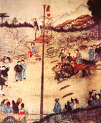 唐人郑处诲在《明皇杂录》中记载一位宫廷歌舞伎王大娘表演的百尺顶竿,上面装着一座木山,仿照仙山“瀛洲”、“方丈”形象,山上还有小儿手持红色符节合乐歌舞。由此可见唐代“载竿”技艺之高超。唐代的“载竿”有“爬竿”、“顶竿”、“车上竿戏”、及“掌中竿戏”等不同形式。唐代达官贵人的出行仪仗中,往往以载竿杂技表演为前导。唐代敦煌莫高窟壁画《宋国夫人出行图》中就是以“载竿”为前导的。唐明皇有“舞马”400骑,不只能依乐曲跳舞,衔杯敬酒,还能“舞马登床”。唐代幻术也极发达,有名的“种瓜”幻术,在唐极流行,惜已失传。