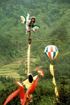 维吾尔族的“达瓦孜”(走立绳)也是高空杂技的一种。近年河南省的“高空飞车艺术团”更以高空节目,打破吉尼斯世界纪录的极致。