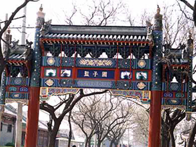 在北京城的东北隅,有一条古老的成贤街,在其人口处和中间,矗立着4座完整的过街牌楼,金碧辉煌。人们走进这条古老的街道,可以远远望见牌楼上三个斗大的金字“国子监”。