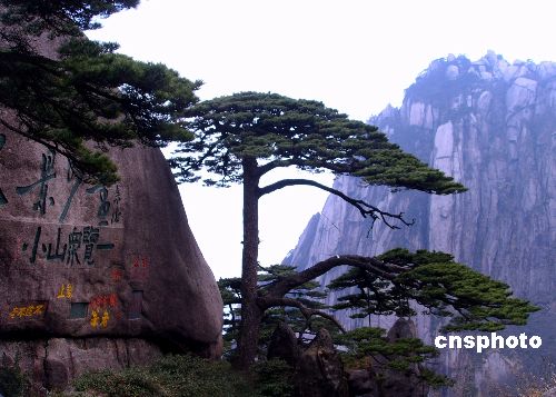 安徽黄山迎客松,是黄山十大名松中第一松。其形象已被作为铁画,悬于北京人民大会堂内,成为中国人民与世界人民友谊的象征。(张绍明 摄 )
