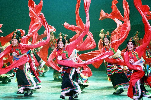 2007年10月6日晚,大型藏族原生态歌舞乐剧《藏谜》在苏州上演。《藏谜》是一部全景式展现藏民族文化的歌舞乐诗篇,几乎涵盖了西藏地区经典的民间歌曲和舞蹈。 新华社发(戚振林 摄)