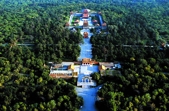 位于沈阳东郊的天柱山上,俗称东陵。是清太祖努尔哈赤和孝慈高皇后叶赫纳喇氏的陵墓。建成于清顺治八年(1651年),康熙、乾隆时期又有部分增建。陵寝占地19.48万平方米,南面正中有正红门,门前有华表、石狮、石坊、下马碑等。进入正红门内为一条笔直的参道,参道两侧,排列着一组石象生。有石狮、石马、石骆驼、石虎等。过108蹬,是康熙二十八年(1689年)增建的碑楼,内立康熙皇帝题撰的《大清福陵神功圣德碑》。碑楼后面的城堡式建筑为方城,是陵园的主体建筑部分。围墙上有角楼四座。北面是明楼,内有石碑一座。方城正中是隆恩门,方城内正中台基上坐落着隆恩殿。方城北面是宝城和月牙城,宝顶下的地宫埋葬着努尔哈赤和叶赫纳喇氏的棺木及骨灰。