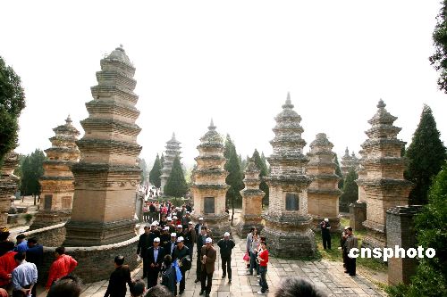 千佛殿内供毗卢佛铜像,因此亦叫毗卢殿。殿内砖地上还保存着20多个直径约4.5厘米的洼坑,是往昔寺僧练拳习武时的脚坑遗迹。脚坑分布方圆不大,呈一条线状,这是僧人刻苦练功的见证,也说明少林拳的所谓“曲而不曲,直而不直“的特点。千佛殿东侧的白衣殿,三面墙绘有少林拳谱壁画,壁画长约20米,很生动地表现少林寺和尚练拳习武的情景.在少林寺西约300米处的山脚下,有一塔林,这是唐以来少林寺历代住持僧的葬地,共250余座。这是我国最大的塔林。塔的大小不等。形状各异,大都有雕刻和题记,反映了各个时代的建筑风格,是研究我国古代砖古建筑和雕刻艺术的宝库。少林寺内还保存了不少珍贵的文物。山门门额上悬挂的“少林寺“匾额,是清康熙皇帝亲笔书写的。山门后大甬道和东西小马道旁立有碑碣数十通,称为少林寺碑林。其中有两通碑刻是留学我国的日本禅僧撰写的。(张燕军 摄)