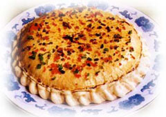 据说,早年还有用发面饼夹上枣,栗诸果的, 或以江米、黄米面蒸成粘糕饼,似“上金”、“下银”的花糕。