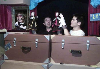 大稻埕偶戏馆的意大利籍艺术家在认真揣摩偶戏人物的动作。