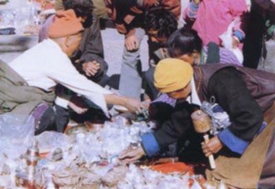 紧贴大昭寺的八角街(也称八廓街)上,当地商人和尼泊尔、印度商人开设的小店铺鳞次栉比,出售各种富有特色的手工艺品。最引人注目的是在街上磕长头的人们。他们双手合十,五体投地,边磕头边前移。这是喇嘛教最高的顶礼膜拜方式,表现信徒们对佛门的无限虔诚。这里有从远方风尘仆仆一路磕头而来的,也有当地的市民,清晨围绕大昭寺磕一圈长头,约半小时,然后回家更衣、净手、吃早饭,再去上班。就像内地人打太极拳、练气功那样,磕长头也是一种全身运动。磕长头依然是宗教活动,然而似乎添加了新的内涵,成为拉萨市民富有独特色彩的一种特殊生活方式。